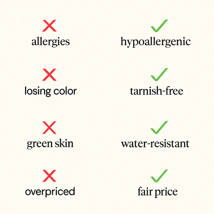 We craft our pieces in high-grade stainless steel and finish them with 18k gold PVD coating—up to 10× thicker than standard plating. This eco-friendly vacuum process creates an exceptionally durable, color-lasting finish built for everyday wear.