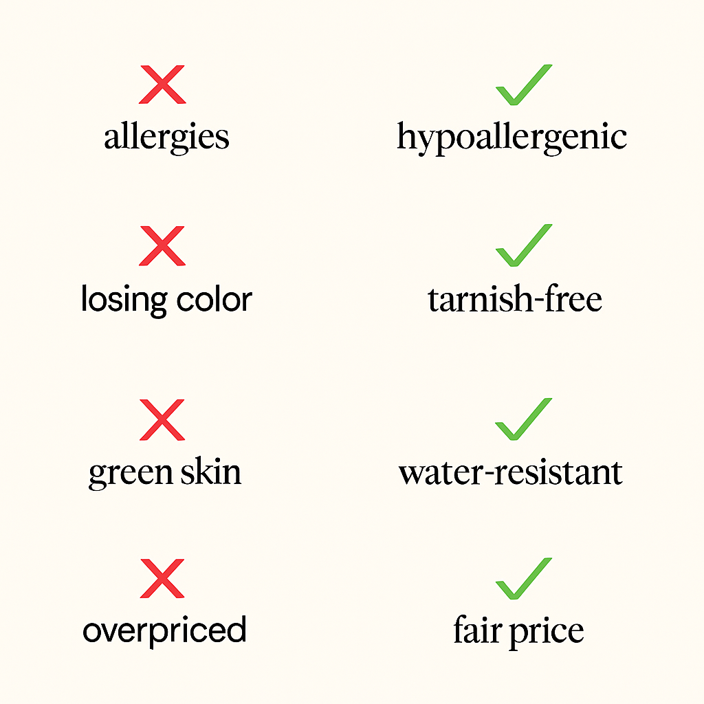 Waterproof, hypoallergenic piece in premium stainless steel with 18k gold PVD and handset zircon stones—safe for shower, swim, and workouts without color fade. Rinse after salt/chlorine; ships in eco-friendly packaging with a sticker pack.