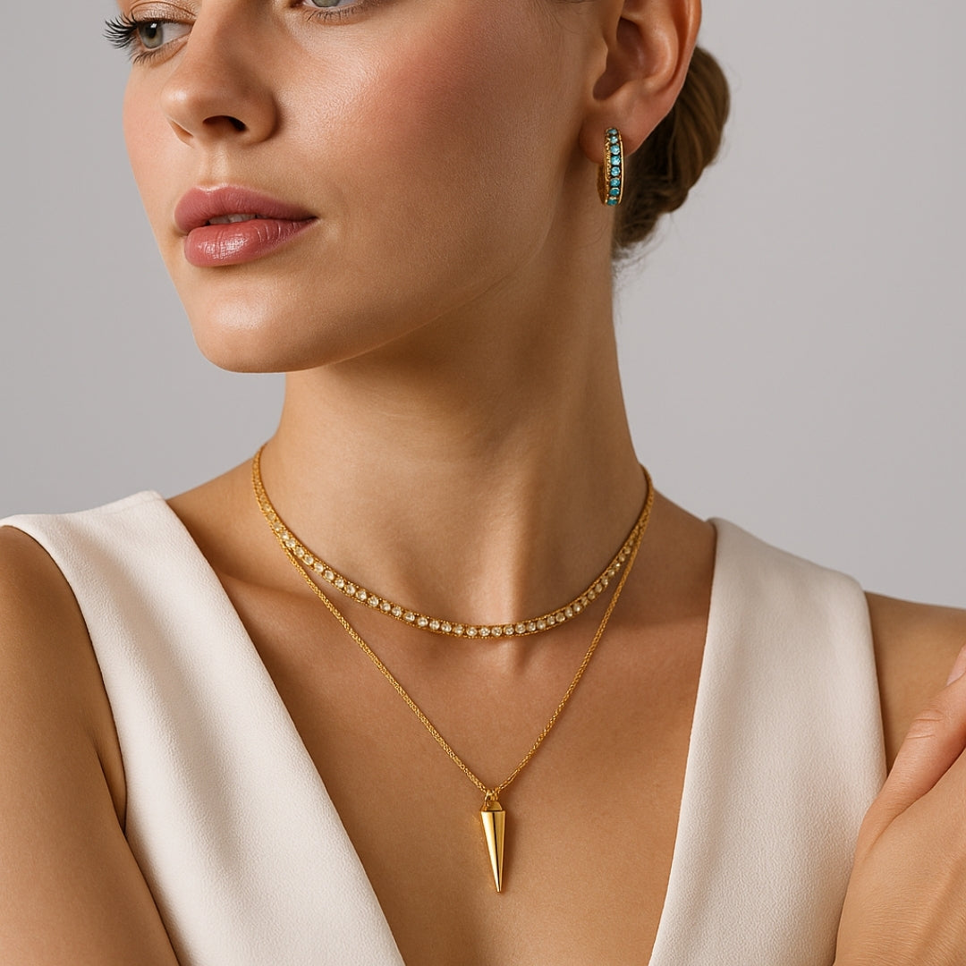 Waterproof, hypoallergenic piece in premium stainless steel with 18k gold PVD and handset zircon stones—safe for shower, swim, and workouts without color fade. Rinse after salt/chlorine; ships in eco-friendly packaging with a sticker pack.